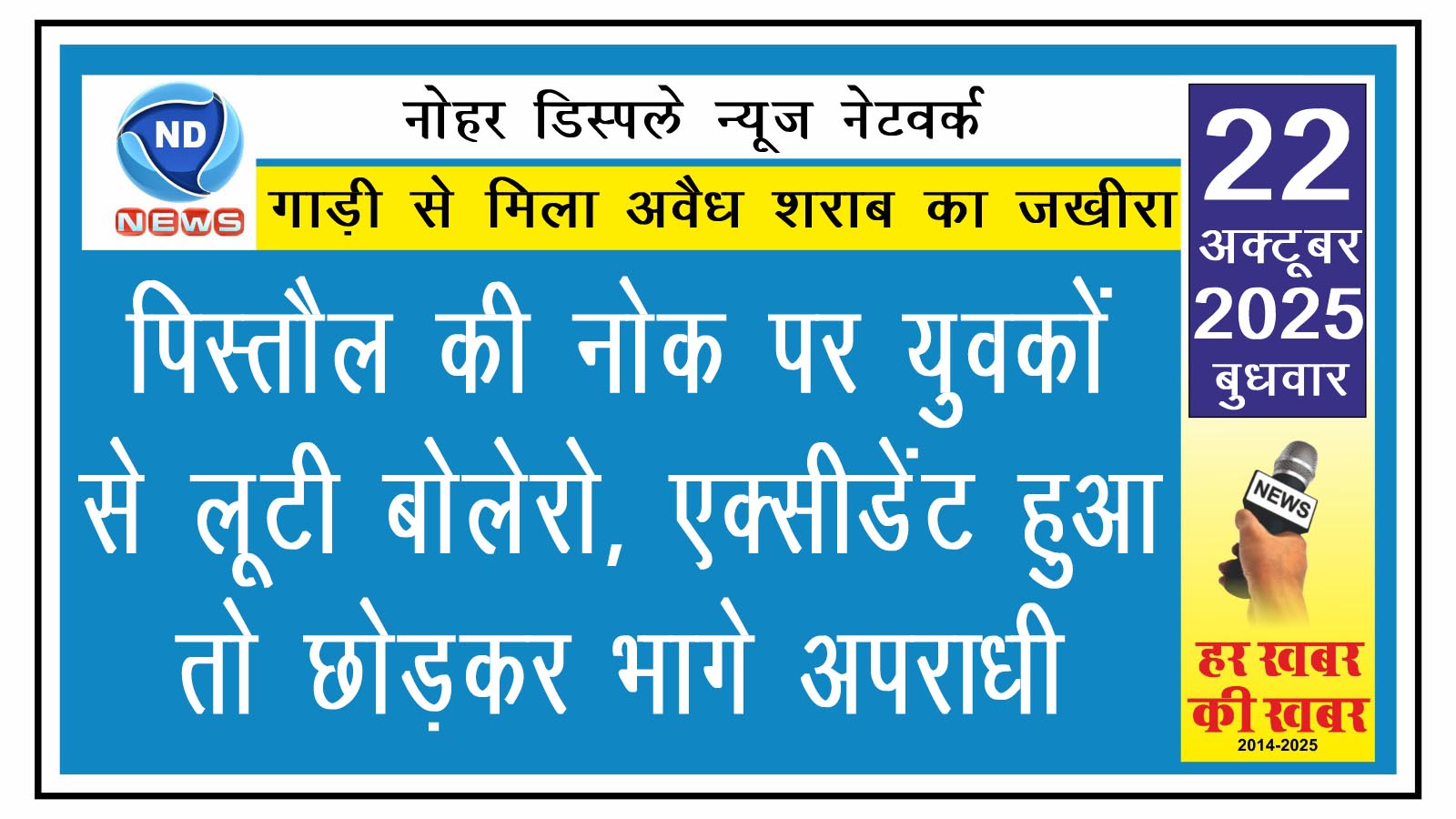 एनडी न्यूज, नोहर। भादरा थाना क्षेत्र में रविवार को दो घटनाएं सामने आईं। पहले एक युवक पर हमला कर बोलेरो गाड़ी लूटी गई। कुछ घंटों बाद वही बोलेरो कलाना हैड के पास दुर्घटनाग्रस्त मिली, जिससे बड़ी मात्रा में अवैध शराब बरामद हुई।
