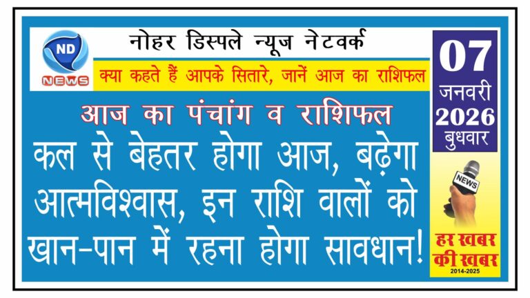 धर्म आज का राशिफल: कल से बेहतर होगा आज, बढ़ेगा आत्मविश्वास, इन राशि वालों को खान-पान में रखनी होगी सावधानी! adminJanuary 7, 2026January 7, 20260 एनडी न्यूज, नोहर। दिनांक : 07/01/2026 सम्वत् : 2082 मास : माघ कृष्ण पक्ष तिथि(aaj ki tithi) : पंचमी तिथि 06:33 AM तक…