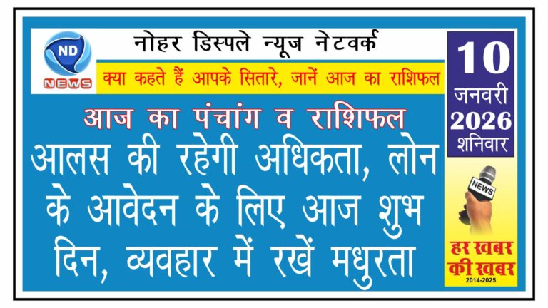 धर्म जाने क्या कहते हैं आज आप के सितारे, दिन की शुरुआत करें राशिफल के साथ adminJanuary 11, 2026January 11, 20260 एनडी न्यूज़, नोहर। आज का पञ्चाङ्ग ?रविवार, ११ जनवरी २०२६? सूर्योदय: ? ०७:२१ सूर्यास्त: ? ०५:४८ चन्द्रोदय: ? २५:३८ चन्द्रास्त:…