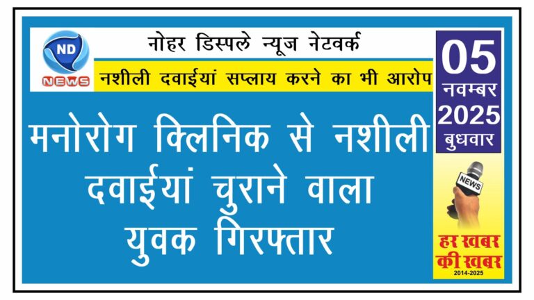 क्राइमनोहर गश्त के दौरान दो युवकों से चिट्टा बरामद, पुलिस ने किया गिरफ्तार adminNovember 4, 20250 नशे के खिलाफ पुलिस की कार्रवाई एनडी न्यूज, नोहर। नोहर पुलिस ने गश्त के दौरान मोटरसाईकिल सवार दो संदिग्ध युवकों…