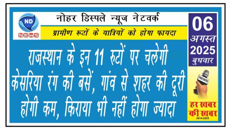 राजस्थान राजस्थान के इन 11 रुटों पर चलेगी केसरिया रंग की बसें, गांव से शहर की दूरी होगी कम, किराया भी नहीं होगा ज्यादा adminAugust 6, 2025August 6, 20250 एनडी न्यूज नोहर। राजस्थान सरकार के द्वारा बजट घोषणा के अनुरूप रोडवेज सेवा से वंचित गांवों को शहर से जोड़ने…