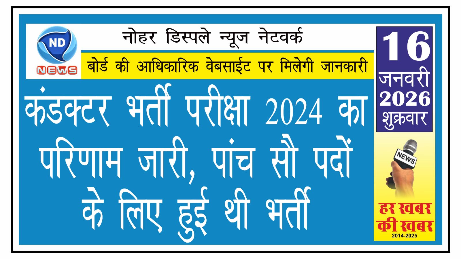 एनडी न्यूज, नोहर। राजस्थान कर्मचारी चयन बोर्ड (RSSB) ने कंडक्टर सीधी भर्ती–2024 के तहत आयोजित परीक्षा का परिणाम जारी कर दिया है। यह भर्ती राजस्थान राज्य पथ परिवहन निगम (RSRTC) के विभिन्न आगारों में कंडक्टर पदों पर नियुक्ति के लिए की जा रही है। बोर्ड द्वारा कुल 500 पदों के लिए चयन प्रक्रिया संचालित की जा रही है, जिनमें 454 पद गैर-अनुसूचित क्षेत्र और 46 पद अनुसूचित क्षेत्र के हैं।