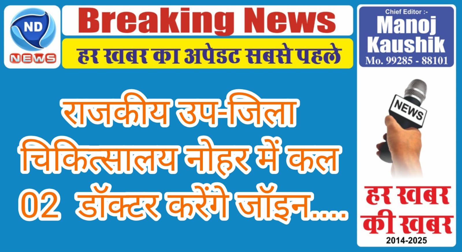 एनडी न्यूज़, नोहर। राजकीय उप जिला चिकित्सालय में कल 02 अगस्त 2025 शनिवार को 02 नए डॉक्टर का आगमन, देंगें निरंतर सेवाएं….