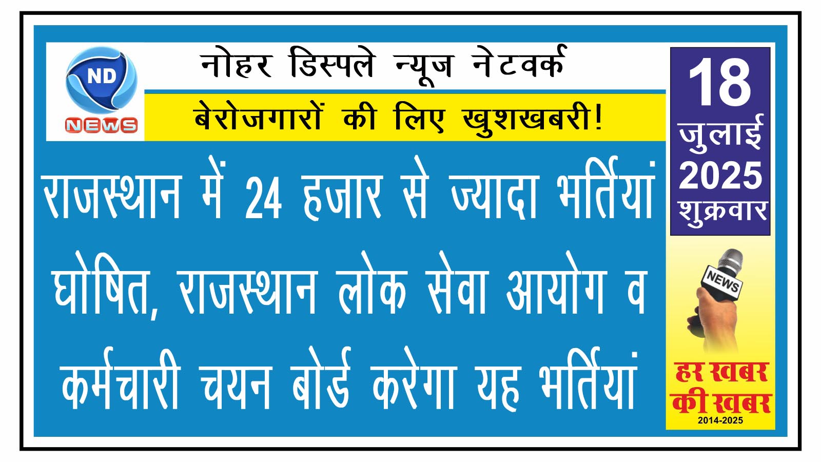 एनडी न्यूज, नोहर। राजस्थान लोक सेवा आयोग व राजस्थान कर्मचारी चयन बोर्ड ने गुरुवार को विभिन्न 24 हजार से अधिक भर्तियों के विज्ञापन जारी किए है।आरपीएससी ने 5 विभागों में 12 हजार 121 पदों पर वहीं कर्मचारी चयन बोर्ड ने 12313 पदों पर भर्ती का विज्ञापन जारी किया है। सहायक कृषि अभियंता के पदों के लिए 28 जुलाई से 26 अगस्त, पशु चिकित्सा अधिकारी के पदों के लिए 5 अगस्त से 3 सितम्बर तक ऑनलाइन आवेदन कर सकेंगे।