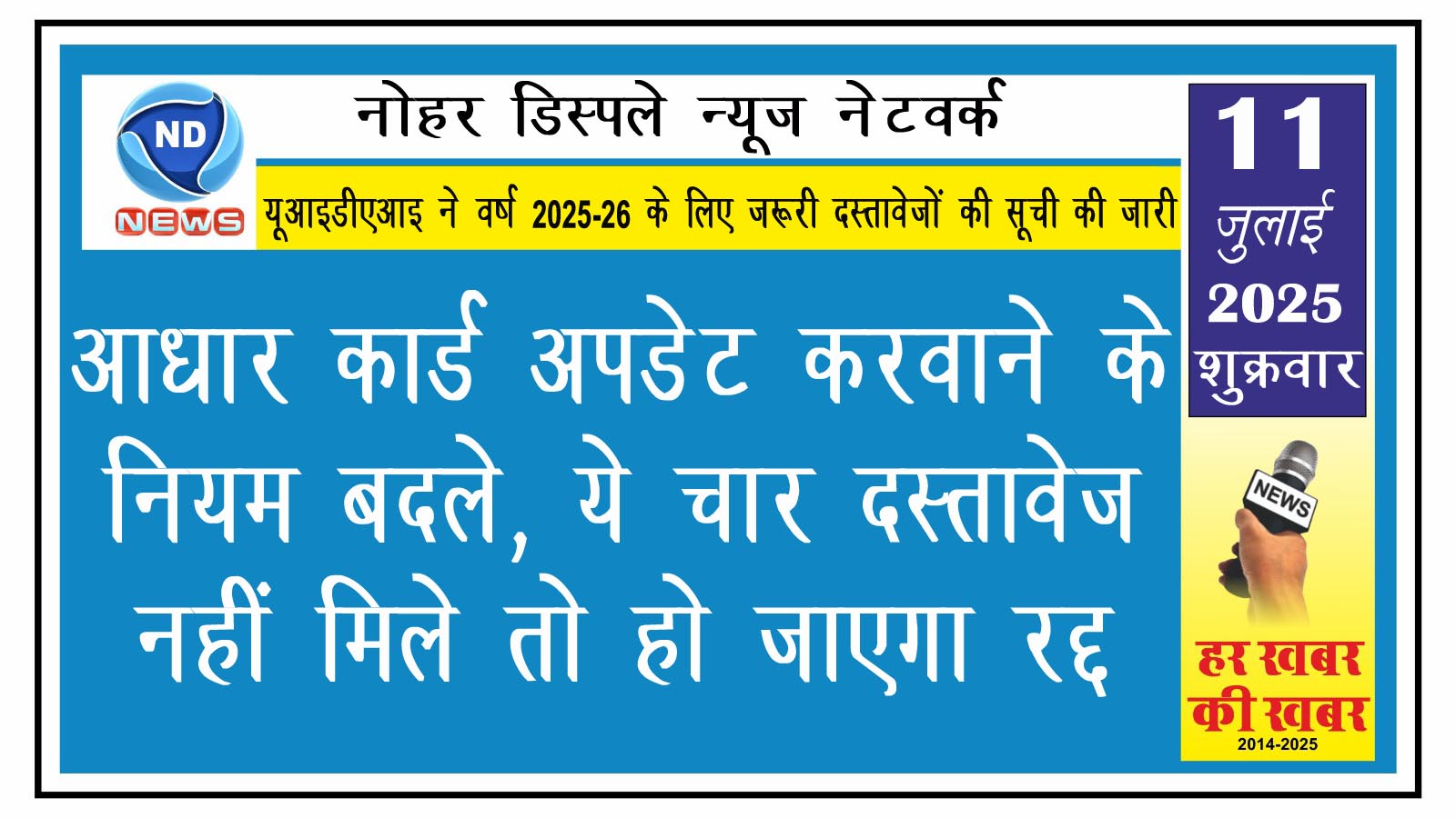 एनडी न्यूज नेटवर्क। आधार कार्ड बनवाने या फिर पुराने आधार को अपडेट करवाने के लिए नियम बदल गए है। भारतीय विशिष्ट पहचान प्राधिकरण (यूआइडीएआइ) की तरफ से आधार में नाम, पता और फोटो में बदलाव करवाने के लिए नई शर्तों का निर्धारण किया है। अब आधार बनाते या अपडेट करते समय चार अनिवार्य दस्तावेज देने होंगे।