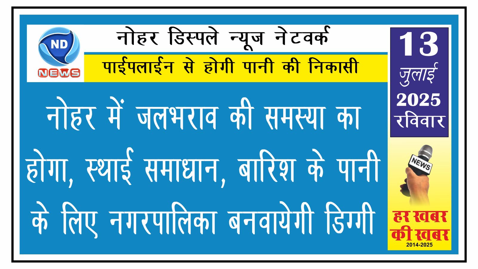 एनडी न्यूज, नोहर। नोहर में दशकों से चली आ रही जलभराव की समस्या के समाधान के लिए नोहर नगर पालिका 3 बीघा भूमि में एक डिग्गी का निर्माण करवाने की योजना पर काम रही है। नगर पालिका ईओ बसंत सैनी ने बताया कि सोनड़ी मार्ग पर वन विभाग की 3 बीघा भूमि में बड़ी डिग्गी का निर्माण किया जाएगा। इसके साथ ही प्राचीन जोहड़ से गौशाला की बीहड़ तक पाइप लाइन बिछाई जाएगी।