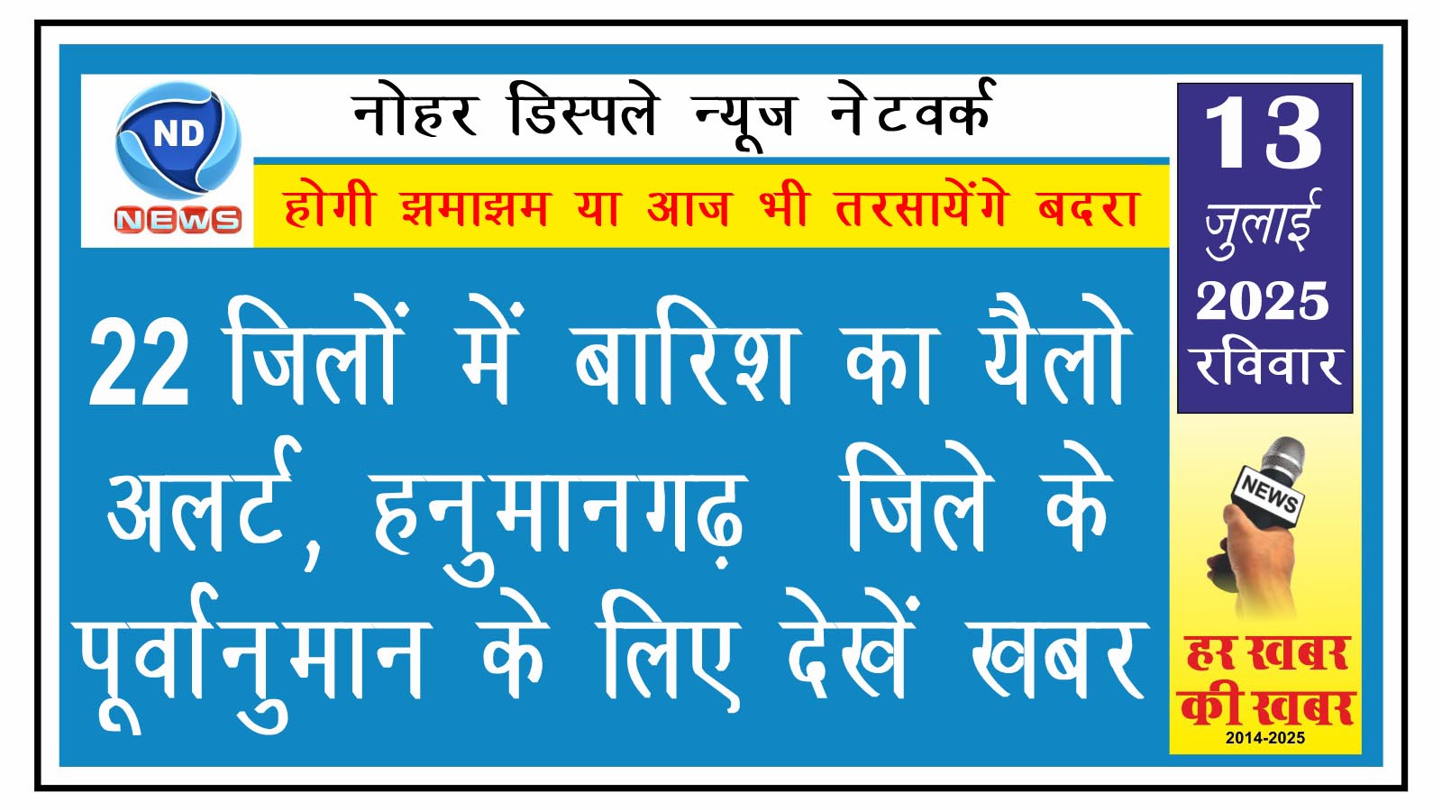 एनडी न्यूज, नोहर। मानसून राजस्थान पर मेहरबान है। एक नए सिस्टम के एक्टिव होने से आज भी 30 जिलों में बरसात का अलर्ट जारी किया गया है। वहीं, शनिवार को भी कई जिलों में झमाझम बारिश हुई है।